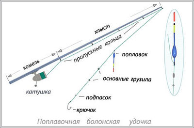 Основными компонентами болонки являются: телескопическое удилище, катушка, леска, поплавок.