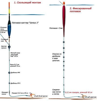 На больших глубинах глухие оснастки непригодны. Здесь целесообразнее воспользоваться скользящим поплавком. Оптимальный выбор будет в пользу слайдеров малого либо среднего размера, имеющих две точки крепления на леске. Они достаточно чувствительны и хорошо заметны.