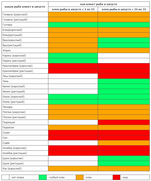 В северных районах к концу августа нередки холодные утренники с инеем. Условия рыбной ловли в первой половине месяца ничем не отличаются от июльских, во второй - наступают некоторые изменения.