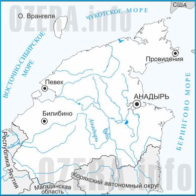 На Чукотке встречаются как привычные нам пресные, так и соленые озера. Солоноватые и соленые озера располагаются преимущественно в пределах северной береговой полосы. Пресные озера, разбросанные по всей поверхности края, имеют преимущественно термокарстовое происхождение и расположены группами в области тектонических впадин. К числу самых крупных озер Чукотки относятся Красное и Эльгыгытгын. Самыми крупными реками региона являются Анадырь, Великая, Большой и Малый Анюй. Питание Чукотских рек преимущественно снеговое и дождевое. Известны на Чукотке месторождения минеральных вод, температура которых достигает 80 градусов.
